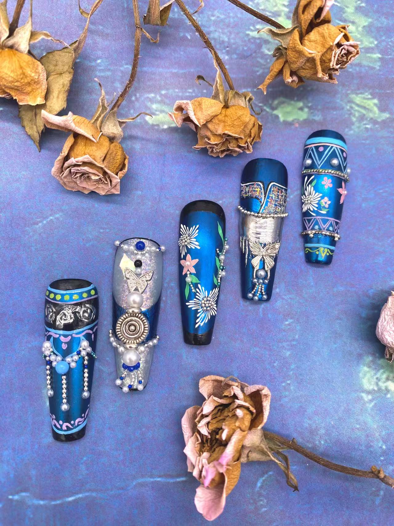 而第四枚、第五枚美甲贴片,同样延续了蓝调的华丽。各种几何图案、精致的雕花,还有珍珠与金属元素的巧妙运用,每一处细节都经过精心雕琢,每一个装饰都恰到好处,彰显着独特的时尚品味。