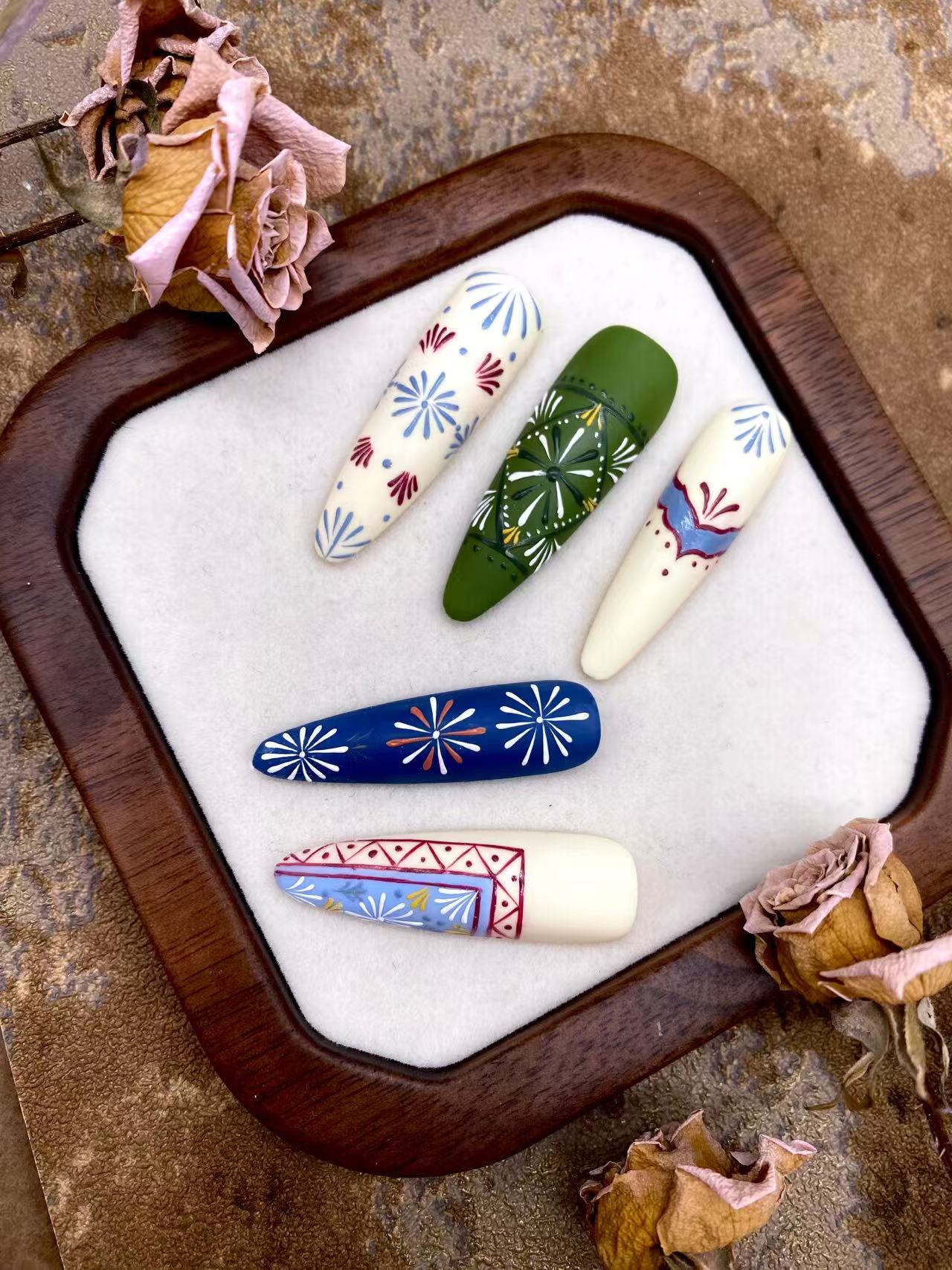 复古从不是旧时光的复刻,而是以现代审美对经典的再创作。这组长尖手绘美甲,把民族的、复古的艺术碎片,拼成了指尖的时尚勋章——戴上它,你指尖流转的不仅是色彩与纹样,更是一场穿越时空的美学漫游。
