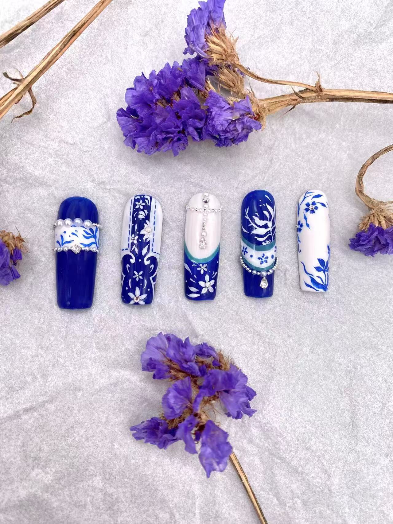 青花瓷,从古代的官窑珍品,到如今融入现代美甲艺术,它承载的不仅是工艺的传承,更是文化的延续。这组美甲,把青花瓷的古韵与现代美甲的创意巧妙结合,让我们在日常的举手投足间,都能与传统文化不期而遇,仿佛指尖之上,正流淌着千年的历史长河,每一次抬手,都是对那份典雅与浪漫的深情回眸,让传统文化以一种全新的、鲜活的方式,走进我们的生活,滋养着我们的审美与心灵。