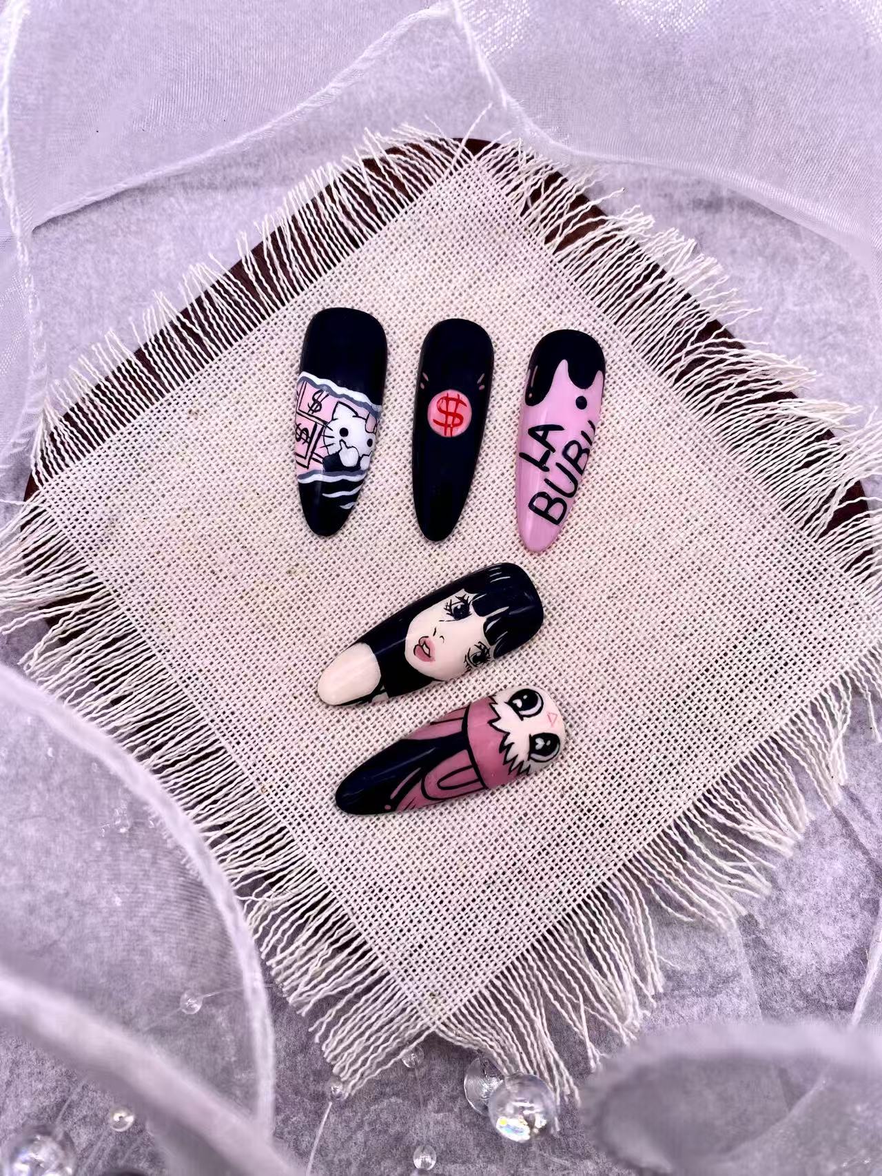 ◦ 图案:画着一个卡通形象,大大的眼睛、独特的造型,结合粉色元素,可爱又俏皮,和其他指甲上的图案风格相呼应,共同构建出一个充满童趣与个性的美甲组合。