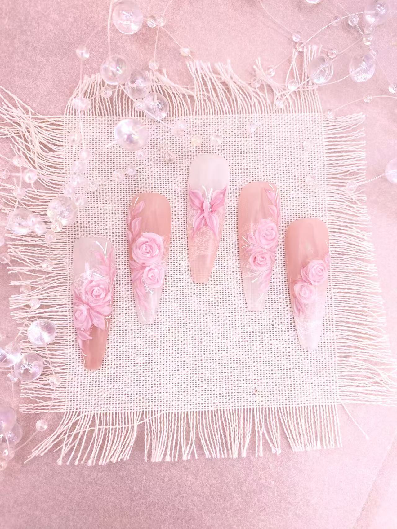 裸透甲底晕染着渐变的粉白,像初绽的云霞轻覆指尖。立体浮雕玫瑰是绝对的主角,每一片花瓣都被精心雕琢,层层叠叠间尽是复古的柔媚;中间那只蝴蝶更是妙笔,粉嫩羽翼与蕾丝纹理交织,似从法式宫廷画里飞出来的精灵🧚♀️